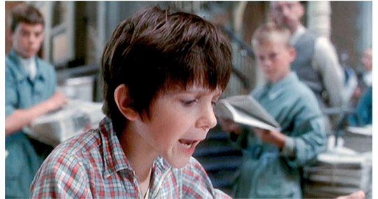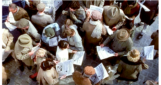 同じ日、路面電車の軌道を横切る時、作業員が石を落としていく(1枚目の写真、矢印は石)。そこに近づく電車。車内にはヨゼフがいる。そのヨゼフの顔をじっと見ていた少年が、「額に ハエがいるよ」と教える。「何だって?」。「死んでる」。ヨゼフは、指で探ってハエを取ると、「あの クソ、ピチェ・ベルめ!」と恨みが募る。その時、窓の外を見ると、ピチェが歩道を走っている。その直後、電車は石に乗り上げて脱線し、ビルにぶつかって止まる。衝撃音を聞いたピチェも現場に駆けつける。そして、電車を降りて来たヨゼフと目が合う(2枚目の写真、矢印は2人)。ヨゼフは当然、ピチェがやったと記者に告げた。夕刊の一面は、「ピチェ・ベル、路面電車を脱線させる/レールに置かれた石で脱線」。売子の場所に行き、この新聞を見たピチェは、「こんな新聞売らない。嘘だらけだ。ボクは、やってない!」と怒る(3枚目の写真)。担当者が「お前はクビだ」と言うと、ピチェは「こっちから、やめてやる! こんな、くず新聞のために働くもんか」と吐き捨てるように行って去りかけるが、「これを書いたバカは? 言いたいことがある」と言って階段を上がってオフィスに向かう。