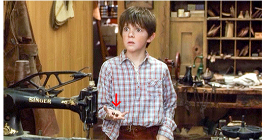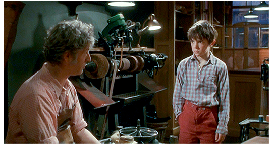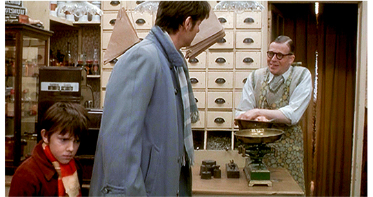 カト伯母さんが、ツェッペリン号を見るためにピチェの家にやって来る。そして、以前ピチェが請求したのを忘れず、ビー玉をお土産に持って来てくれる。父は、ピチェに「フェールマンの店で、靴墨を買ってきてくれ」と頼む〔薬剤店で靴墨なんか売っているのか?〕。ピチェが店に入って行くと、奥から2人の話し声が聞こえる。「厚く剥くな」〔オーゼビエスは足の爪を切り、息子のヨゼフにジャガイモの皮を剥かせている〕。「芽を取り除かないと」。「それにしても、厚い」。「古いじゃがいもだから、柔らかいんだ」。「何個 剥いたんだ?」。「6個」。「実が ほとんど残ってないぞ」。オーゼビエスのケチさ加減と、ヨゼフの不器用さがよく分かる。「今夜、マルタに結婚を申し込むんだ」。「金はあるのか?」。「安く済ませるよ。レモネードだけだ」。「女は 金がかかる。婚約指輪を欲しがるぞ」。「バーゲン品で安く済ませるから」(1枚目の写真、矢印はジャガイモ)。実に嫌な親子だ。そこまで盗み聞きしていたピチェの口が、突然誰かの手でふさがれる。叫ばないための用心だ。それは、フェイリンハだった。「ここで、何してるの?」。「君を捜してた。ここに入るのを見てね。家族が増えるな〔マルタがヨゼフと結婚する〕」。「ヤだよ、そんなの。何とかしないと。助けてよ」。そこに、声を聞きつけたヨゼフが奥から顔を出す。「やあ、ポール。ピチェ・ベルの最新ニュース、知りたくないかね?」(2枚目の写真)「最新ほやほやの情報を、教えてやる」。その時、隠れていたピチェが姿を現し、「あんただったのか!」と抗議する。ヨゼフはおののくが、「何が?」としらばくれる。ピチェはフェイリンハに、「彼が情報源なの?」と訊く(3枚目の写真)。「ああ、悪質な情報源だ」。ピチェは、「あんた、ボクの先生で、隣人で、その上、すぐに…」とまで言って、耐えられずに店を出て行く。フェイリンハは すぐに後を追い、ピチェに、「君に謝りたい。ヨゼフだけを責めるのは不公平だ。私も悪いんだ。君は正しかった。私は真実に目を向けず、売り上げだけを考えていた」と謝る(4枚目の写真)。そして、「病院の少年は回復した。彼は、誰が本当の犯人か言ったんだ」と打ち明ける。「病院? そこに、情報源がいるの?」。「どういう意味だい?」。「ボクの姉さんを、『嫌な奴』から遠ざけときたいんだ」。「何とかなるかも」。