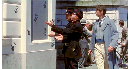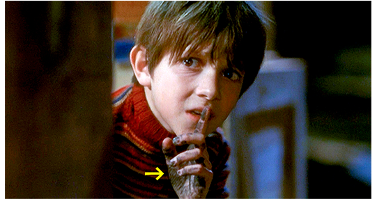 ここから、映画の様相が異なってくる。ここまでは、第1作の『Pietje Bell』(1914年)と第4作(時系列順には2番目)の『Pietje Bell's goocheltoeren(ピチェ・ベルの手品)』(1924年)に準じていたが、ここからは、第7作(時系列順には4番目)の『Pietje Bell is weer aan de gang(ピチェ・ベルの復活)』(1934年)に準じる。ピチェが仲間の1人エンゲルチェとボールを蹴って遊んでいると、ボールが建物の地下室に入ってしまう。そこには何もなかったが、雰囲気が気に入ったピチェは、「ここは 『強盗の巣』だ」と、以前使った言葉をもう一度使う。「ボクらの秘密の隠れ家だ。ここから、新聞と戦うんだ」。「何が できるんだ?」。「まだ、分からないけど、奴らの相手になるのは…」。そして、「名前を考えないと」と、首をひねる(1枚目の写真)。ピチェは、埃で真っ黒になった自分の手を見て、「黒い手〔Zwarte Hand〕だ」と思いつく(2枚目の写真、矢印)。それからしばらくして、街中に、靴墨で手型を押した「黒い手」が溢れ出す(3枚目の写真)。