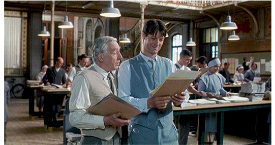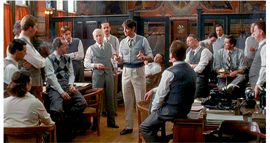 『最新ニュース』では、フェイリンハが記者全員を集めて、「町中に、『黒い手』が溢れている。背後には誰が? 理由は? 全員が、この事件の担当だ。我々なら、この謎が解ける」と指示している(1枚目の写真)。記者が出て行った後に、ヨゼフがやって来る。フェイリンハ:「ピチェ・ベルの先生、何か用事かね?」。「内々で、話せませんか?」。そして、ヨゼフは、こう申し出る。「ピチェ・ベルについて、いくつか面白い話があります。彼には詳しいですから。ひょっとして情報を買う気はありませんか?」(2枚目の写真)〔最低の教師〕。「我々は正直な新聞社です。少なくとも、そう努力しています。今は、『黒い手』で手一杯でしてね」。こうして、ピチェの作戦は当たり、ヨゼフはすごすごと帰る。