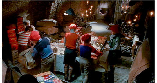 かくして、街中に黒い手の印を付けるだけだった「暇なグループ」は、倉庫に大量に置いてあった食料品その他を、貧しい人々に配る「義賊団」へと変身した。1枚目の写真は、倉庫から持ってきた物で、プレゼントの包みを作っている団員たち(ピチェは左端の赤と白の横縞のセーターの少年)。次のシーンでは、貧しい一家が、寂しい鍋を囲んでいるとドアがノックされる(子供が7人もいる)。父親がドアを開けると、そこには『黒い手』の印を押した大きな紙包みが置いてある。父親がそれを持って中に入るのを、ピチェとエンゲルチェが見ている(2枚目の写真、矢印は紙包み)。贈り物作戦が進行してから、エンゲルチェが、「スプルートにも、あげちゃダメかい?」と尋ねる。あれほど裏切られたピチェだったが、「分かった。リストに加えよう」と同意する。しかし、結果は悲惨だった。スプルートの、「何か届いてるよ」の言葉で出てきた父ヤンは、「ウチが貧乏だと? がらくたと一緒に消え失せろ!」と言って、紙包みを蹴散らす(3・4枚目の写真)。