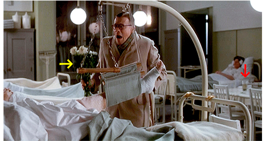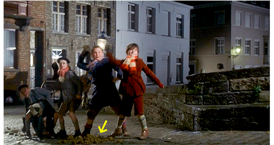 ピチェは、ヨゼフが8時に姉と会うと聞いていたので、その前に会うべく外で隠れて待っていた。そして、ヨゼフが店を出てくると、「ヨゼフ、マルタから手紙。今、病院だよ」と、慌てた振りをして手紙を渡す(1枚目の写真)。「脚を骨折したんだ」。さらに、「急がないと。あんたがいないって寂しがってる。あんたに、いて欲しいって」と、嘘の追い討ちをかける。ヨゼフは病院に直行する。中に入り、「マルタ・ベルを捜しています。足を骨折した人です」と看護婦に訊く。フェイリンハに協力を頼まれていた看護婦は、「私が案内します。こちらへ」と大部屋に連れて行き、「4つ目のベッドですよ」と教える。ヨゼフは、テーブルに飾ってあった花を引き抜くと、ギブスで固めた脚が吊られているベッドに行き、「大切なマルタ。痛むかい。ダンスは残念だったね。でも、ここに来られたし、聞きたいことがあるんだ」と話しかける〔患者の顔は見えていない〕。「マルタ、結婚してくれる?」。その言葉に驚いた老婆が振り向く。「あたしとかい?」。ヨゼフは驚いて声も出ない(2枚目の写真、黄色に矢印は花束、赤の矢印は花束の入っていたコップ)。ヨゼフは、「ピチェ・ベルの悪魔め! 捕まえたら、あいつ…」と息巻いて病院から出てくる。ピチェとその仲間は、それを待ち構えていた。そして、路面に馬が落としていったホカホカの糞を全員でヨゼフ目がけて投げる(3枚目の写真、矢印は落ちている馬糞、4人の後ろには馬も見える)。追いかけようとして馬糞の上で滑ったヨゼフを、ピチェは「天罰だ」とあざ笑う。