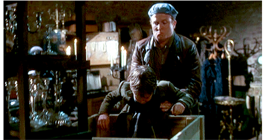 ピチェとスプルートは、運河船(橋をくぐれるように背が低く、狭い水路を通れるように細長い)の船首にある荷物室に隠れていた。暗くなって船が動き始める。開口部から覗いたピチェに、スプルートが「摩天楼 見える?」と訊く。こちらも、世界地理に対する認識はピチェと似たり寄ったり。「ううん、2人の男だけ」。この2人、実は泥棒。太ったクロックの方が、ロープを取ろうと開口部から手を入れ、ピチェに触れる。「下に誰かいる。手に触れた! 警官か密告者だ。捕まったら10年はくらうぞ!」(1枚目の写真)。痩せで落ち着いたトゥーンは、怖がるクロックを笑い、「顔を拝んでやろうぜ」と言ってランプで照らし、「見つけたぞ」と2人を引っ張り上げる(2枚目の写真)。