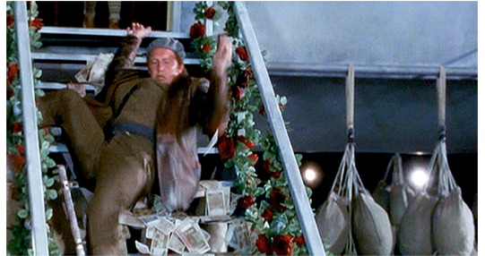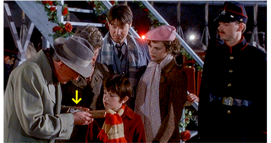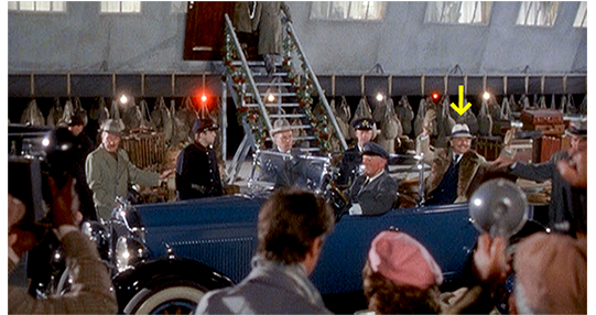 ツェッペリン号には、借り主のアメリカの新聞王に招待されたオランダの新聞王スタークがやって来る(1枚目の写真、矢印はスターク、手前中央にはフェイリンハと姉が映っている)。画面は変わり、ツェッペリン号の客室内。スプルートの父が、アテンダントに、「スタークさんに贈り物を。お気に入りの葉巻の箱だ」と告げている。「分かりました。でも、船室では禁煙ですよ」。スプルートが、葉巻の箱を持ってスタークに近づいて行く。予め打ち合わせができていたらしく、スタークは、「いやぁ、坊や。わしに贈り物かな?」とスプルートに声をかける。「お父さんが、この葉巻を。残りは、船荷に」。スタークが箱を取ろうとしたので、スプルートは「現金、前払いで」と制止し、スタークは、現金の入ったスーツケースを渡す(2枚目の写真、矢印はガラス片の入った箱)。スタークがすぐに中を見ようとしたので、スプルートは「乗務員が見てます。火を点けないか心配で」と言うが、その言葉は数秒しか効力がなかった。スプルートが離れると、スタークはすぐに箱を開け、中身がガラス片だと気付く。当然、「そのガキをとめろ! 連れ戻せ!」と叫ぶ。ヤンが拳銃を構えて飛び出し、スプルートからスーツケースを奪う(3枚目の写真)。そのままバックして、うまく逃げられるハズだったが、出口の階段の前にはピチェがいて、伯母にもらったビー玉を通路にバラまく。ヤンは滑って転び、そのままタラップを転げ落ち、紙幣が散乱する(4枚目の写真)。