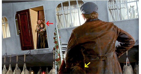 怒ったヤンは、階段の上のピチェ目がけて撃つが(1枚目の写真)、タラップなので揺れて当たらない。ヤンは撃つのをやめてタラップを揺さぶり、ピチェは落ちまいとタラップを駆け下り、ヤンに飛びかかる。しかし、結局捉まり、銃を突きつけられる。ツェッペリン号の開口部では、スタークがスプルートを捉まえ、「息子の命が大事なら、金を払った物を渡せ! さもないと、突き落とすぞ!」と脅迫する(2枚目の写真、赤い矢印はスタークとスプルート、黄色の矢印はピチェの頭)。ヤンが、「持っとらん。ダマしたんだ」と嘘を付くと、すかさずピチェが、「持ってる! セーターの下だ!」とバラす。破れかぶれになったヤンは、スターク目がけて銃を撃ち、弾は逸れたが、スタークは手を離し、スプルートは地面に落ちて倒れる。ヤンが茫然としている隙に逃げたピチェは、スプルートに駆け寄る(3枚目の写真)。ピチェの声を聞いスプルートは、「ねえ、ピチェ、ボクはもう友だちになれない。悪いのはボクだ、君を裏切ったから。なぜか分かる? 君はピチェで、ボクは違うから」と言うと、気を失う。