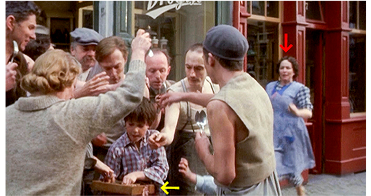 ピチェの家では、靴下履きで帰宅した息子に、母が、「何で、靴を あげたりなんかしたの?」と咎めている(1枚目の写真)。「あげるなら、要らない物になさい」。ピチェは、さっそくそれを実行する。店の外に出ると、「フォークにスプーン! ご自由に!」と叫ぶと、あっと間に人だかりができて奪い合いになる。それに気付いた母が店から飛んでくる(2枚目の写真、黄色の矢印はカトラリー入りの箱、赤の矢印は母)。「何するのよ!」。「フォークとスプーンなんか、山ほどあるじゃない!」。「後で、たっぷり お説教よ。今は、顔も見たくないから手伝ってらっしゃい」と父の所に行かされる。陽気な父は大笑いしただけ。