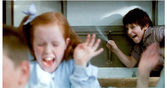授業中、ピチェが最初にした悪戯は、前の席に座っている双子の女の子のお下げ髪の先端を結んだこと(1枚目の写真、矢印は結び目)。その間にも、授業は進んでいる。「オランダは球根で有名です。チューリップ、クロッカス、ヒヤシンス、スイセン。ハーレムの郊外には球根畑が広がっていて、球根は世界中に売られて行きます」。姉は、ピチェが何も聴いていないことに気付き、「前に出て来て、私が言ったことをくり返しなさい。ハーレムと球根畑の話ですよ」と命じる。教壇の地図の前に立ったピチェは、しどろもどろに話し始める。「ええと、花畑が… 畑が球根で…」(2枚目の写真)。後は、すらすらと、「球根はオランダ産の花で、郊外はハーレムだよ」。めちゃめちゃな内容に生徒たちが笑う。姉が、「喜劇役者なのね」と言うと、すかさず、「姉さんには負けるよ」と突っ込み、生徒たちがまた笑う。姉は、さっきから しゃっくりが止まらない。そこで、「マルタ、水、持って来ようか?」と訊く。「放っといて。これは、唯の…」。ピチェは教室の後ろにある洗面台に行き、棚の上からコップを取る。「席に戻って。しゃっくりを止めるから。驚かせて止めようなんて…」と言いかけるが、姉の危惧が実行に移される。ピチェは、水道をひねると 蛇口を指で押えて水を噴出させ、生徒たちに掛ける(3枚目の写真)。生徒たちは逃げるが、おさげを結ばれた双子は動けない。その混乱状態の最中にヨゼフが新入生を連れて入ってくる。あまりの混乱振りに、ヨゼフは、「校長先生の指示で新入生を連れてきたんだぞ!」と怒鳴るが、誰も聞こうとはしない。ピチェは、最後列の机の上に立って棒を振り回し始める(先端に輪が付いている)。すると、後ろの棚に置いてあったインク瓶が引っかかってしまい、真っ直ぐヨゼフに飛んで行き、顔にインクがかかる。激怒したヨゼフは、机の上のピチェにつかみかかると、顔を引き寄せ、「お前には、もう うんざりだ!!」と怒鳴る(4枚目の写真)。唾液過多症なのか、ツバがいっぱいピチェにかかる。「傘がいるよ〔Ik heb een paraplu nodig〕」〔どんな場合でも、減らず口は止まらない〕。ヨゼフはピチェを引っつかむと、学校の玄関まで運んでいって、外に放り出す。様々な要素が濃密に詰まったとても面白いシーンだ。