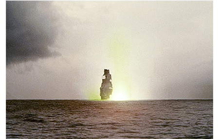 いよいよ待ち望んだ瞬間が訪れる。水平線にゆっくりと太陽が沈んでいく。2人は息を詰めて見守る。そして、太陽の最後の輝きが消えた一瞬、緑色の閃光が光る。2人の顔は驚きから喜びへと変わる(1・2枚目の写真)。ウィルを乗せたフライング・ダッチマンが、入り江に向かって静々と入ってくる(3枚目の写真)。