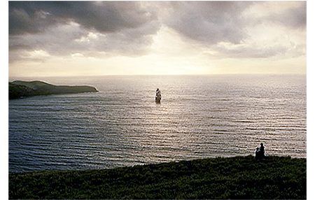 そして、それからちょうど10年後、エリザベスは、9歳になった息子のヘンリーを連れて、海を見渡せる崖の上に連れて行く。ヘンリーは、海賊の歌を口ずさんでいる。「♪ヨーホー、ヨーホー、俺たちゃ海賊だ。腹黒で、除け者、ろくでなし。襲って、荒らし、盗んで、奪う。さらって、ものにする、容赦などしない。飲み干せ、みなの衆、ヨーホー」(1.2枚目の写真)。その姿を嬉しそうに見るエリザベス。そして、そのエリザベスをヘンリーが見上げる(3枚目の写真)。