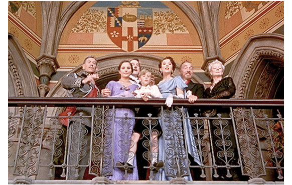 映画の冒頭、エドワード4世の軍が勝利を収めると、その後に、即位を祝うパーティのシーンが続く。そこでは、まず、ヨーク家の主要メンバーだけで記念写真を撮る(写真)。写真に映っているのは、左から、①グロスター公リチャード(エドワード4世の弟〔末弟〕、後のリチャード3世)、②エドワード4世の王女エリザベス(後の、ヘンリー7世の王妃、有名なヘンリー8世の母)、③エドワード4世、④ヨーク公リチャード(エドワード4世の次男)、⑤エドワード4世の妃エリザベス、⑥クラレンス公ジョージ(エドワード4世の弟)、⑦ヨーク公妃(エドワード4世、クラレンス公ジョージ、グロスター公リチャードの母)。