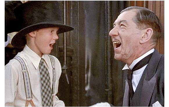 王太子を乗せた列車が駅に到着する。摂政であるグロスター公の指示で、出迎えは最少限の関係者のみ。王子は、手を振って(1枚目の写真)、兄を迎えに走って行く。列車から降りた王太子は、この場面が初登場(2枚目の写真)。歴史的事実は、12歳と9歳だが、映画の王太子はどうみても青年だ。出迎えが少ないのに驚いた王太子に対し、グロスター公が嘘の言い訳を述べていると、王子が寄って来て、「リチャード叔父様」と 手を引っ張り、列車の中に連れていく〔王子に対して、優しい叔父の顔を見せるところが怖い〕。次に現れた時、王子はグロスター公のシルクハットをかぶっている。そして、「猿のように小さいから、肩にかつげるでしょ」と言って(3枚目の写真)、不具の左肩に乗ろうとしたので、激痛のあまりグロスター公は倒れ、王子も投げ出される〔この時も、王子に対しては怒らない〕。
