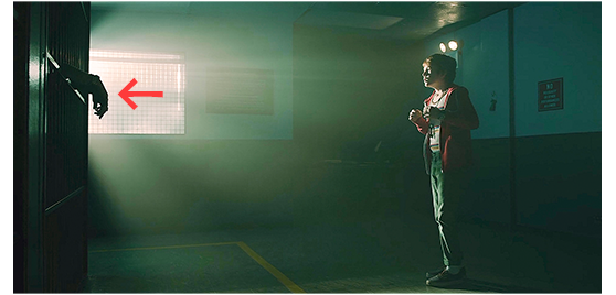 4人は町まで降りてくると、ゲイブリエルの提案で警察署に向かう。街路は、恐らく航空機の落下で惨状を呈している(1枚目の写真)。ゲイブリエルは、ある事情があって警察署には入りたくないので、自転車を見張っていると言って3人だけに中に行かせる。3人が真っ暗な中を入って行くと、机の上にあった1枚の紙には、「緊急/強制避難/ロサンゼルス盆地で核兵器の使用許可される/一次指令/エイリアンの本拠地を発見せよ」と書いてある。アレックスが、誰かいないかと奥に進んで行くと、一番奥は監房になっている。そこ取り残された1人の男(ルー)が、アレックスに声をかける。「おい、怖がるな、こっちへ来い」(2枚目の写真、矢印はルーの手)。「鍵はあそこにある。渡してくれんか」。そこに、ダリウシュがやってきてルーに気付く。アレックスが「出して欲しがってる」と説明すると、ダリウシュは断固反対する。そこに、さらに、ジェンジェンも加わる。「どうしたの?」。質問はアレックスにしたのだが、ルーは、「奴ら、俺を放っておいて逃げやがった」と同情を誘うように話す。ダリウシュは、キーで世界を助ける方が先だと言い、可哀相だと思うジェンジェンに対し、「警察が、こいつを残して行ったのには絶対ワケがある。その判断は尊重すべきだ」と珍しく正論を言い、ジェンジェンは、「どんな人でも、このまま入れておくのは間違ってる」と、情に流された誤判断を主張する。ルーは、父親として息子を放っておけないと嘘を付き、“父に対して特別な思い”のあるアレックスは助ける方を選んでしまう(3枚目の写真)〔鍵を床に投げ、自分達が去ってから鍵を取るよう約束させる〕。