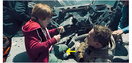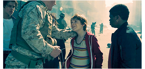 自転車に乗りながら、ジェンジェンが、「なぜ、あなたの時計、動いてるの?」とアレックスに訊くと、「機械式なんだ〔かすかに見える盤面のデザインから推定して、ブライトリングのナビタイマー(自動巻き)であろう/販売価格100万円以上→だから、映画の冒頭で、母が、「ホントに、パパの時計を付けて行きたいの?」と訊いた〕。パパのなんだ」。4人が交差点に差しかかると、いきなり3台の軍用車両と出会う〔軍用車はなぜ走ることができるのか?〕。4人は自転車を放り出すと、「助けて!」と車列の後に向かって叫ぶ。停まってくれないので がっかりしていると、後ろから迫って来た兵士の小隊に、「動くな!」と命じられる。4人は即座に両手を上げる(1枚目の写真)〔ビッグ・ベア湖から降りて数十キロ以内にこんな大きな町はな/この場所が、先ほどの警察署の近くなのか、あるいは、次に里程標が示されるサンガブリエル・バレーの近くなのかは一切分からない〕。4人が人間の子供に過ぎないと分かると、小隊長は、「君らは、何時間も前に退避すべきだった。戦争なんだぞ」と諌める。アレックスは、「僕たち、攻撃が始まった時、山の中にいました」と理由を説明した上で、「何が起きてるんですか? 攻撃は大規模なんですか?」と尋ねる。そこに、口出ししたのが、ダリウシュ。「国一番のメルセデスの販売代理店、大丈夫かな? パパがオーナーで、俺が跡継ぎなんだ」と、自分勝手なことを口走り、ジェンジェンから、「黙って!」と一喝される。小隊長:「私に言えるのは、ここにいたら危険だということだ。今すぐ、バスに乗りなさい。君らを避難所に連れて行く」。アレックスは、「ちょっと、待って。このキーをパサデナまで届けないと」と、一番大切なことを口にする(2枚目の写真、矢印はキー)。小隊長:「どこで手に入れた?」。「宇宙ステーションの飛行士が、渡してくれました」。ゲイブリエル:「JPLまで届けて欲しいって」。ダリウシュ:「そのキーで、エイリアンを止められる」。アレックス:「パサデナのJPLに行って、フィールディング博士に渡して」。小隊長:「JPLのフィールディング博士からのモールス信号は受信してる。このキーの発見は、最優先事項だった。ありがとう、君たち。これで、世界が救われるかもしれん。ちゃんと届けるからな」(3枚目の写真)。4人は、他の兵士からも、「よくやったな」と褒められてバスに乗る。