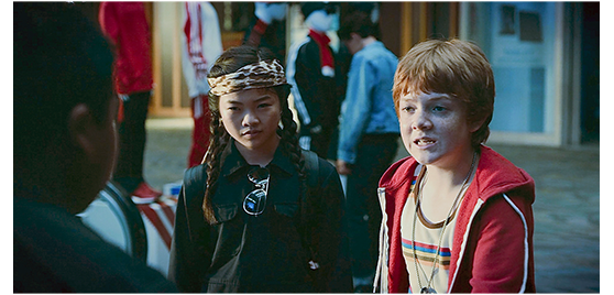 4人がモールを出た時、アレックスは、「1973年型フォード・マスタング・マッハ1」と言う。「パパが、あれとそっくりなのに乗ってた」。ゲイブリエル:「それって、コンピュータなんか付いてないんだろ?」。ということは、今でも動くことを意味している。4人はモールで調達した自転車を放り出して車に向かう(1枚目の写真)。アレックスはさっそく運転席に乗り込むが(2枚目の写真)、笑顔は、マニュアル車だと分かると同時に消える。いざ、出発しようとするが、マニュアル車に乗ったことのないアレックスの運転で、車は、同じ場所をブレーキから白煙を上げながら回転するだけ。結局、なぜかジェンジェンが運転する(3枚目の写真)〔なぜ、11歳の中国人が大型のマニュアル車を運転できるのか?〕。