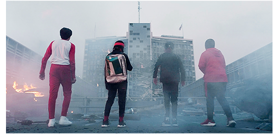 ビルの屋上では、3人が、半ばあきらめながら、アレックスの無事を祈っている。そこにアレックスが煙の中から現れる。アレックスは「やった!」と叫び、3人は歓声をあげてアレックスに抱きつく。その時、上空で大きな爆発音が聞こえる。4人が見上げると(1枚目の写真)、エイリアンの母船が爆発している(2枚目の写真)。「やったな!」。「やったぞ!」。アレックスとジェンジェンは互いに微笑みあう。ジェンジェンは、「すごく勇敢だったわね」と言って、時計を返す。アレックスは、「ホントにそう思う?」と訊く。ジェンジェンは答えず、キスを待って目を閉じる。しかし、アレックスが物怖じして何もしないので、アレックスの襟をつかむと、力ずくでキスする(3枚目の写真)。映画は、4人が肩を組んで空を見上げ、雄叫びをあげるところで終わる。「僕ら、世界を救ったんだ!」。