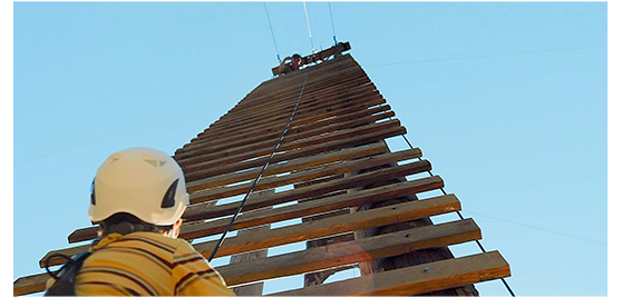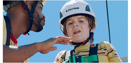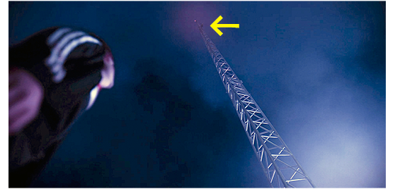 アレックスが屋上まで出て見ると、パラボラは、高い鉄塔の先についていた(1枚目の写真、矢印の先の黒い点)。キャンプと違って命綱もないが、アレックスは思い切って塔を登り始める。その途中で、非常用電源が入り、制御室の監視カメラに、パラボラのすぐ近くまで登ったアレックスが映る。しかし、もう1台の監視カメラには、屋上に現れたエイリアンが映っていた。制御室にいた2人は、屋上にあるスピーカーを使って必死に危機を伝える。アレックスが、恐る恐る下を見ると、エイリアンが塔を登ってくる(2枚目の写真、矢印)。アレックスは、足で蹴飛ばしてパラボラの向きを変えようとする〔どの方向にするか、映画の中では教えてもらっていないが…/足で蹴るだけで、正確な調整ができるのか?〕。エイリアンが近づいた時、アンテナの向きが正しく変わり、ライトがレッドからグリーンになる。アレックスは、そのまま塔のてっぺんまで行き、エイリアンに捕まる寸前、塔を支えている3本のロープの1つに吊り下がって滑り降りる(3枚目の写真)。アレックスのシーンは、子供にできる範囲の限界に挑戦していて、結構ハラハラさせられる。