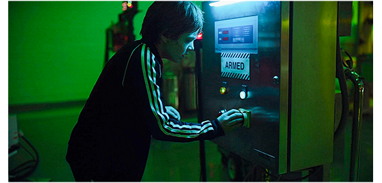 制御室での状況を振り返ろう。ジェンジェンが非常用電源を入れるのに成功した後、ゲイブリエルが将軍に指示されてモニターをONにすると、画面に「エクスカリバー」と表示される。次に、コリンズ少佐の暗号化キーを挿入する。データのアップロードが完了する。この後は、パラボラが衛星を向くまで待っていなくてはならない。危機一髪でアレックスが無事成功した後は、2つの起動キーを2人で同時に回す必要がある。ところが、ダウリッシュは、ダムでエイリアンに腹を切られたため、失神してしまう。将軍は、まず、2つの起動キーを金庫から出すように言い、「96322103」の順にボタンを押すよう指示するが、算数障害のゲイブリエルは何度やっても失敗する。幸い、一時気が付いたダウリッシュが、紙に数字を書いてくれたので、金庫が開き、起動キーを取り出すことができた。しかし、ダウリッシュはまた失神。そこに、エレベーターで上がってきたジェンジェンが合流する。2人はカードキーを差し込み、一緒に回そうと、「3、2、1」まで数えるが(1枚目の写真)、その時、アレックスを捕まえるのに失敗したエイリアンが、天井を破って侵入する(2枚目の写真、矢印)。2人が襲われる寸前、エイリアンと2人の間にルービックキューブが落ちてくる。エイリアンが振り向くと、そこにはアレックスがいた。アレックスは、「こっちへ来い、この野郎!」とワザと自分の方に エイリアンを呼び寄せる(3枚目の写真)。そして、2人に、「エクスカリバーを起動させたら、外で会おう」と言い残し、囮(おとり)になって逃げて行く。エイリアンがいなくなると、今度は、起動キーを同時に回すことに成功。地球軌道上の3つの人工衛星にも稼動を開始、命じられた方向に向きを変える。3基が狙う先はエイリアンの母船(4枚目の写真)。
