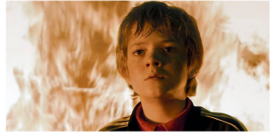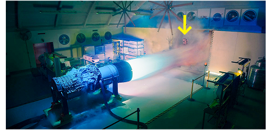 アレックスが向かった先は、JPLに入った時に気付いていたプラズマ・ロケットのテスト室。アレックスは、ロケットの噴射装置をONにする(1枚目の写真)。エンジンが回り始め、噴射の準備が始まる。そしてエイリアンが部屋に入って来る。エイリアンが噴射口の前に来た時、アレックスは信号弾を撃ち込み、プラズマに点火させる。エイリアンは、すさまじいプラズマ噴射で壁に叩きつけられる(2枚目の写真、矢印はエイリアン)。6000℃の高熱でエイリアンも再生不可能なまでに燃え尽きる。噴射が止んでも、高熱で部屋自体が火事になる。アレックスは、昔、火事の時に、自らを犠牲にして救ってくれた父のことを思い出す。そして、父の声に導かれ(3枚目の写真)、炎の中に飛び込む。