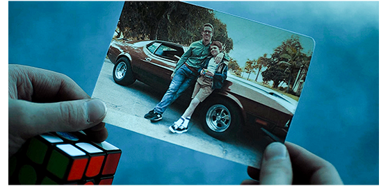 夕方になり、キャンプの管理人達が見ているTVからは、「NASAの発表では、再三の試みにもかかわらず国際宇宙ステーションと連絡がつかないそうです。しかし、その原因については公表されていません。搭乗中の3人の科学者に危険が及ぶ可能性についても、全力で通信の復旧に努めているとの回答しか得られない状況です」という音声が流れている。それに気付いた宇宙オタクのアレックスがドアの外で見ていると、木の段の下にいてアレックスに嫌味を言った男が、ドアを閉めてしまう。他の子供たちは、薄暗くなり始めた林の中を、ケミカルライトを持って走り回っている。アレックスは、ルービックキューブを回しながら歩いていたが、湖岸までくると、父を失った火事のことが頭を過ぎり、「アレックス」と父に呼ばれた気がして、肌身離さず持っている父とのツーショット写真を見る(1枚目の写真)。2人が寄りかかっているのは、父の愛車だったフォード・マスタング・マッハ1(1973年型)〔エンジンは4900ccから7000ccまで4種類あるが何れもV8/映画の中盤で重要な役を果たす〕。アレックスは、悲しい思い出を忘れようと、キャンプの外れにある橋に向かう。すると、反対側から橋を渡ってくるジェンジェンに気付く(2枚目の写真)。2人はそこで足をとめ、敢えて近づかず、欄干にもたれて空を見上げる。すると、流れ星が横切っていった(3枚目の写真)。2人は、何を願ったのだろう〔ジェンジェンについては、終盤で分かる〕?