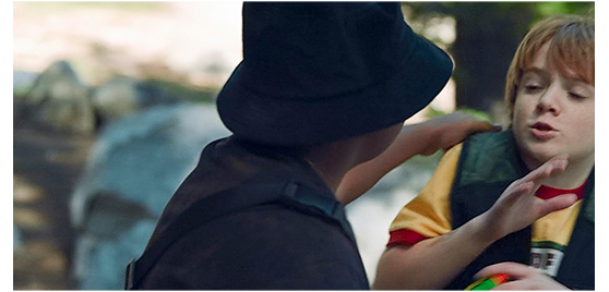アレックスと母は、キャンプの入口につく。ここにも、はっきりと、「Rim of the World(世界の縁)」と表示されている。映画の原題だ。「凄いじゃない。きれいなトコね」(1枚目の写真)。母は、アレックスを その気にさせようと必死だ。「みんな、あなたと同じくらいの年頃じゃない」。アレックスは、緊張して、ルービックキューブを放せない(2枚目の写真、矢印)。いきなり、声がかかる。「アレックス! 俺がリーダー、ローガンだ」。それは、おどけた感じの20代の黒人男性。「なあ、見回してみろよ、どれもこれも面白そうだろ。面白いの一号が ここにいるカールだ」。そこには、別の黒人がいる。「俺たちで、君に黒人の文化を教えてやる。見てろよ」。そう言うと、2人で手をパチンと何度も叩き、最後に親指でパチンし、「これが黒人の握手だ。真似するなよ。黒人専用だ」といい加減なことを教える。そこに、ダリウシュが到着。荷物を両手に持った運転手に、「ジャコビ、俺の服は 小売店みたいにちゃんと畳めよ。シワは嫌いだ」と 生意気に命令する。ローガンが、「小売店?」と訊くと、「金持ちだからさ。あんたには関係ない」と、またまた減らず口。ローガンは、生意気坊主は放っておいて、アレックスに仲間のミュージシャンを紹介する。「おい、アレックス、ちょっぴり踊ってみないか? ダンス、知ってるか?」。アレックスは、あまりのハイぶりに戸惑うばかり(3枚目の写真、ソバカスはほとんど見えない)。