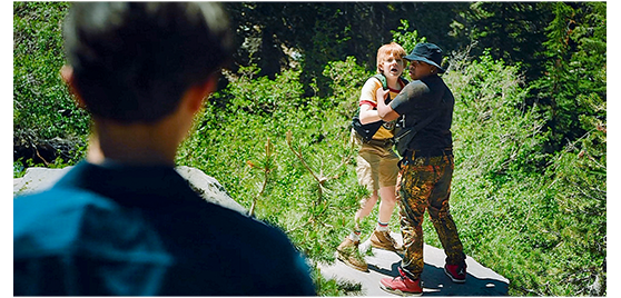 ジェンジェンは湖を離れ、どんどん登って行く。アレックスが、「ジェンジェン、どこに行くつもり?」と声をかけても、振り向きもしない〔アレックスは、英語が分からないのかと思ってしまう〕。「こんな遠くまで来るべきじゃない。もう戻ろうよ」。アレックスは、どのくらい登ったか振り返る(1枚目の写真)。彼が、心配して後ろばかり見ているうちに、ジェンジェンの姿を見失ってしまう。そのジェンジェンは、高台まで登り、キャンプのパンフレットと見比べ、同じ地点に立ったことを確かめると(2枚目の写真)、急に笑顔になる。3枚目の写真は、参考までに、ロケ地のマンモス湖の同じ地点からの写真〔パンスレットと全く同じ〕。よほど有名なアングルらしく、同じ場所で撮った写真がネット上に溢れている。映画では、キャンプのあるのはビッグ・ベア湖になっているが、こちらは、こんなに美しくない。ならば最初からマンモス湖を舞台にすればいいようだが、ロスの北400キロにあって遠すぎる。さて、アレックスがジェンジェンを捜していると、母からセルホンに電話が入る。この時、電話で出ていたら、その後の展開は変わっていたかもしれない。しかし、木の陰から突然ダリウシュが現われ、アレックスは電話を取れない。アレックス:「こんなとこで、何してるの?」〔実際、観客だってそう思う。ここが湖岸の林の中なら分かるが、アレックスがいるのは湖からかなり登った地点。なぜ、ダリウシュがそこにいるのか全く理解できない。あまりにイージーで、ご都合主義的な脚本だ〕。ダリウシュ:「ただの、クソ〔deuce〕だ。そこでウンチしてきた。夕べから頭を出してたからな。あたり一面、緑から茶色に変えてやった」と言い、「ちょい話そうぜ」とアレックスに触ろうとする。アレックスは。汚い手で触られまいと必死(4枚目の写真)。ダリウシュ:「これから、エクスポージャー療法をやるぞ〔心的外傷後ストレス障害の治療法の一つ/ダリウシュはなぜこんな専門用語を知っているのか?/アレックスが木の段の上からロープで降りられなかったことに対する「親切」のつもり〕」。「不衛生だよ」。「恐怖を乗り越える手助けだ」。そう言うと、ダリウシュはアレックスを崖っぷちまで連れて行き、下を見るよう強要する。アレックスが嫌がって叫んでいると、「彼を放してやれ!」と言う声が聞こえ、2人とも振り返る(5枚目の写真)。そこには、年上の少年が立っていた。ダリウシュは、「山のホームレスなんか、消えちまえ。お前のなんか平気だぞ」と言うが、アレックスは助けを求める。「最後の警告だ」。この言葉とともに、ダリウシュは、アレックスを地面に突き倒すと、少年の前に立ちはだかり、「クラヴ・マガ〔イスラエル軍の格闘術〕を5年やったんだ、このバカめ」と大口を叩く。しかし、それは大げさな格好だけで、少年に一発でノックアウトされる。少年に助け起こされたアレックスは、お礼を言った上で、「君は誰?」と尋ねる。「僕は、ゲイブリエル」(6枚目の写真)。「この辺りに住んでるの?」。「まあな」〔ゲイブリエルがここにいるのも、とても無理にある設定。あり得ない偶然が重なり過ぎている〕。