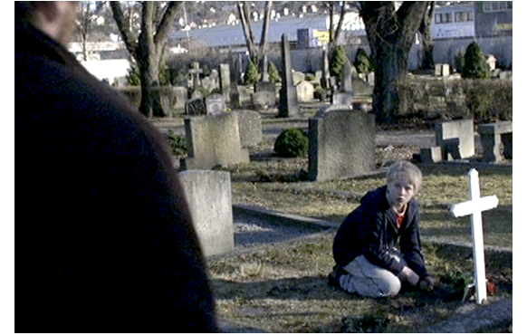 ここで、タイトルが入る。母の入った棺桶の前で、最後の別れの涙を流すポール。「さよなら、ママ」。父は、自責の念からか、「ちょっと 知人に会ってくる」と言って、そそくさと立ち去る。翌日、ポールを学校へ送るため車へ。鍵がない。アパートに戻るだけなのに、失敗を認めたくないが故に、「近道を知ってる」と強引に歩き始める。ポールは「学校に、遅れちゃうよ」と気が気でない。体操服もないことに気付くが、「そんなもん、借りたらいい」。ひどい父親だ。遅刻した学校では、優しい担任の先生の指示で、生徒全員がポールを励ます手紙を順番に渡してくれる。