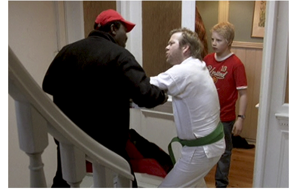 アパートに戻ると、父がソファーに寝ている。「胃痛がひどくて」。その割にビールは飲むわ、ポールが自分でパンを切り始めると「ピザでも取るか?」。そして、ポールに電話で注文させる。電話を切ってポールが「1時間で届かなかったら、無料だって」と言う。カンフー映画を観ている間に、自分は黒帯まであと一歩だったと自慢げに言い、空手着に着替えてくる。しして、やり方を如何にも名人ぶってポールに教える。「さあ、本気でかかって来い」「それじゃ、女の子だ」とけしかけ、ポールが本気で腹に一発決めると、胃痛のせいにする。そこにピザが届く。「注文したのは4時15分だ。今は5時半だからタダだろ」とイチャモンをつけケンカに。最後はピザを奪おうとして床に散乱してしまう。それを見て、「まだ、5時5分前じゃないか!」と怒るポール。父は、さらに後でバーに飲みに行き、アベックに絡んで、怒った男性に放り出され、路上で激しく殴られる。心配で後をつけて行ったポールは、必死に止めて父を助け、アパートまで抱えて戻る。