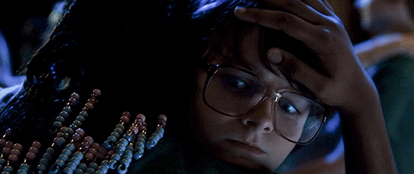 2人は、原作と違い、別々のベッドに入り、メガネを最初にかけた時の体験を話す。それが一段落すると、少女は、「もっと前に訊くべきだったけど、しなかった」と言い出す。「何を?」。「あんたの名前、知らないわ」。「バカげた名なんだ… ハウイ」〔原作では、「ほんとはハワードなんだけど、みんなハウイって呼ぶんだ」〕。「私、グレースよ」〔原作ではローラ〕。その後、グレースは、両親は昔、ヒッピーで、パパはまだそのまま、だから ほとんど会わないと話す。ハウイは、改めて、「よろしく」と手を差し出す。グレースも「よろしく、ハウイ」と言って手を握り合う(1・2枚目の写真)。ちょうど、2人の前のTVでは、男女のキスシーンをやっている。それを見たハウイの顔には緊張と期待が。しかし、グレースがお休みといってスタンドを消してしまうと、そこには落胆だけが残る(3枚目の写真)〔映画を観ていて疑問符がつくのは、部屋に入り込んだのは朝。すぐにシャワーを浴び、なのに、いつの間にか夜になっている〕〔原作では、先に引用したように、清掃が終わってから一度昼寝をし、夕方になると、お腹が空いたのでモーテルのレストランに行く。そして、キーを見せれば何でも食べられると分かり、夕食を済ます。問題はその後に起きた。掃除婦が怪しいと思って2人を見張っていたのだ。理由は、①部屋を掃除した時、荷物がなにもなかった、②2人が夕食に出て行った後に部屋を覗いたら、少年と少女が同じベッドで一緒に寝ていた(もう1つのベッドはまっさらだった)の2点。ローラは、ボーイフレンドは誰かと訊かれ、うっかり弟と言ってしまう。しかし、宿帳にあったのは両親と少女の3人家族。この緊急事態を解決するため、トイレから出てきて事態をハラハラしながら見ていたハウイは、火災報知機を鳴らし、混乱に乗じてグレースを救い出す〕。
