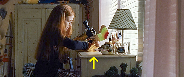 そんなグレースの姿を見送るハウイの顔には、寂しさと諦めが…(1枚目の写真)。そしてカメラは引いていく(2枚目の写真)。映画は、それから1年と少し後に飛ぶ。グレースが家から出て郵便受けを見に行くと、ハウイからの封筒が届いている。彼女は、急いで部屋に戻り、封筒を開ける(3枚目の写真、矢印)。そこから、グレースの独白が始まる。「秋には、ハウイは、コネチカットの家族に養子に迎えられた。私たちは、連絡を絶やさなかった。次の夏、ママは私たちを博物館に連れて行き、そこで人体の薄切り展示を見た。NASAではロケットも見た」。そして、封筒の中の「あの時撮った写真」を見る(これまで、先行して紹介してきたもの)。封筒には、貸借記録のメモ帳も入っていた。1ページ目には、几帳面な字で、「山小屋/湖畔道路2022番地/オールバーグ、ノースカロライナ/- スープ1缶/- パンツ/- トレーナー/- Tシャツ/- カメラ/7ドル」と書かれている。メモ帳の裏には、「トール・パイン〔キャンプのあった場所〕にはお金を返しに行けそうもありません。僕の分の半額を同封します」「薄切りにされた人たちが誰だか分かりましたか? 僕、彼らのことを よく考えます。ハウイ」「追伸 ブライスは間違ってました。君は、『とびっきりの美人』でした」。それを読んで、グレースは幸せそうに微笑む〔原作には、事後談は何も書かれていない。この先、2人はどうなるのだろうか? 時々会い続けて、最後には結ばれるのだろうか?〕。