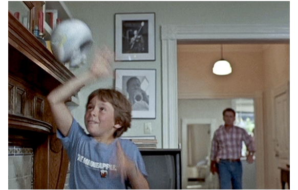 郊外の住宅地。8歳の息子クリスの3人家族の朝が平和裏に始まった。昨夜は友達を呼んだパーティで明け方まで飲んでいたので、8時半だというのに父はまだ起きてこない。クリスはロッキングチェアを揺らしながら大好きな酋長の人形を見ている(1枚目の写真)。母に「さあ、食べなさい。遅刻するわよ」と言われるが、クリスは無視。母は、さらに、「いい加減になさい。第2次世界大戦を始めるつもり?」。「第3次世界大戦だ」。「困った子」。その時、コーヒーメーカーからコーヒーが溢れ始める。「8時半よ、カル」の再呼びかけで、ようやく父が起きてくる。「何で 遅いんだと言ってくれなかった?」。「言ったわよ」。「君の友達は、今朝何時に帰ったんだ?」。「あなたの友達じゃなくて? 3時頃だったわ。前なら、一晩中もったのに」。「そうなんだが、もたなくなってね」。「何が もたなくなったの?」とクリスが訊く。父は、冷蔵庫から牛乳を出そうとして床に落としてしまう。床に溢れ出る牛乳。それを見て、靴下を履きながら笑うクリス(2枚目の写真)。