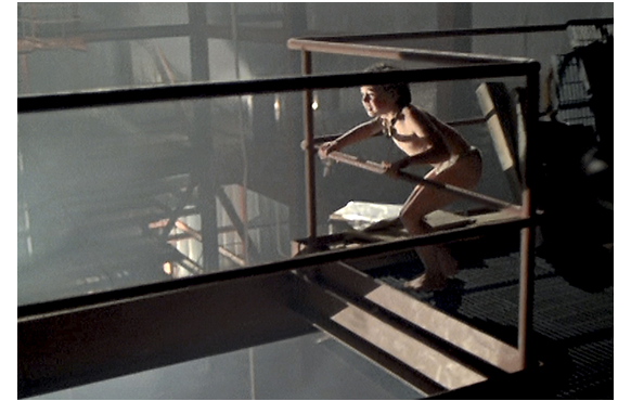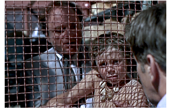 麻薬更生協会の会長が、とっさにクリスをつかんで逃げる。エレベーターに乗って上に向かう会長(1枚目の写真)。まだクリスはぐったりしている。階段を駆け上って、2人を追う父とマーティ。途中でマーティは別れ、黒魔術で対抗する黒人と対峙し、持っていたライターの火を得意のマジックで発火させ、黒人の顔を焼いて目を潰した。一方の父は、息子と会長に追いついたが、間に金網が邪魔している。会長が開口一番で口にする「神はそのひとり子を賜わった」は、ヨハネの福音書3章16節の冒頭の有名な言葉だが、その後に続く邪教の発想は訳す気になれないので省略し、クリスの登場部分のみ紹介する。会長がクリスを金網に押し付け、「息子を捧げろ。神々が命を下さる」と父を説得しようとする(2枚目の写真)。父は、会話を続けるフリをしながら、金網の突破口を見つけ、会長と一対一で戦い、金属棒で刺し殺す。それを見ているクリス(3枚目の写真)。かなり意識が戻ってきている。