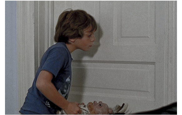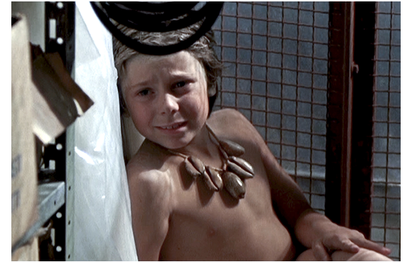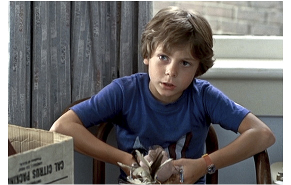 祖父母のアパートを訪れた父子。クリスは、さっそく祖母に拾った貝を見せる(1枚目の写真)。「きれいね。誰からもらったの?」。「見つけたんだ」。「ホント? デニスにも見せて」〔デニスは祖父〕。「これは何だね?」。「僕の貝」。「そうか、君の貝なのか?」。「うん」。「確信があるんだね?」。「そう」。父が、それを見て、クリスに「まだ持ってたのか?」と訊き、祖父には「望みを叶える貝だとか」と説明する。祖父はクリスに、「これは、何をするためのものだと思うかい?」と尋ねる。「知らない」(2枚目の写真)。「ネックレスかな?」(3枚目の写真)。最初は、無邪気な「知らない」という顔。次は、ワザと答えをはぐらかしたように見える祖父への不信感が表れた顔。わずか1秒での切り替えは、如何にもハーディらしい見事な演技だ。この貝は、「破壊と疫病の神、原始的な邪教の神の象徴」という説明がずっと後でなされる。従って、この貝を持っていることは危険極まりなく。しかも、祖父はこの貝の意味を100%理解している「邪教の主」なのだ。