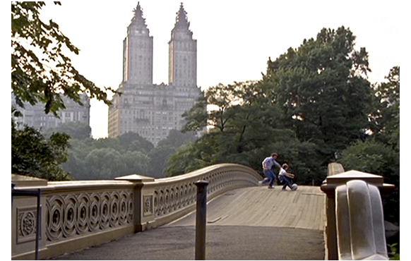 近くのセントラル・パークで遊ぶ父子。有名なボウ・ブリッジの上でサッカー・ボールを取り合っている(1枚目の写真)。父が、公衆電話から顧問弁護士のマーティに電話をかける。マーティ:「電話するなと言ったろ。何だい。忙しいんだ」。父:「やあ、元気か?」。「最高さ。で、アパートは素敵だろ? 全部、俺が自分で探したんだ。家主は いい女だろ? どれだけ苦労したか、分かってるのか? 手数料は、あるんだろうな?」。「黙れったら。よくやったよ。素晴らしい。気に入ってる」。「どこにいる? 15分遅刻だぞ」。「公園だ」。「公園だ? そんなトコで何してる? ここに来る約束だろ?」。「途中さ。クリスも一緒だ」。「そりゃ、素晴らしい」。「一緒でも、いいのか?」。「もちろん」。この2人、大の親友なのだ。そして、マーティはクリスが大好きときている。電話をしている間に、クリスは、池の岸の岩の向こうに姿を消してしまう。そして、女性の悲鳴が響き渡る。心配になり、「クリス!」と飛んでいく父。女性が叫んだのは、林の中で変な儀式の行われた後を見つけたから。蝋燭が岩の上に何本も立てられ、鳥の死体や、切断された猫の首などが散乱している。クリスは、地面に落ちていた不思議な貝殻を拾う(2枚目の写真)。タカラガイの殻口にカラフルな小球が一列に嵌め込まれている。弁護士事務所に向かう途中、クリスが「パパ、神様を信じる?」と意外なことを訊く。そして、父に貝殻を見せる。「これ どうしたんだ?」。「見つけた」。「どこで?」。「公園で」。「公園のどこで?」。「どこかさ。これ望みを叶える貝だ」。「どうして分かる?」。「分かるんだ」(3枚目の写真)。