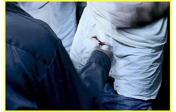 M エヴァンは、さっそく、坊主頭の男と金髪の男の監房を訪れ、いいなりになりますと従順な振りをする。フェラチオしろと、2人が壁に並んで立つ。エヴァンは、それらしく前にしゃがみ込むと、隠し持ったナイフで男たちの陰部を切りつける(写真M-1/写真A-3)。その時、打ち合わせ通り、カルロスが房内に入り、誰も入って来られないよう、内側から鉄柵を閉める。エヴァンは、カルロスが渾身の力で鉄柵が開かないよう押さえている間に、男たちによって奪われていた日記を必死で読む。何とか間に合って、13歳の廃車置場の場面の直前に入り込む。トミーと会う前だ。森の中にエヴァン、ケイリー、レニーの3人がいる。エヴァンは、以前レニーが、犬を入れた袋のロープが堅く締まっているので「開けられない!」(写真G-3)と言ったのを覚えているので、ロープを切るものが何かないかと捜し回る。結局みつかったのは鉄片。それをレニーに渡しながら、「これを持ってて欲しい。今日は君の贖罪の日だ。あの女性と赤ちゃんに、罪の意識を持ってるだろ。今日、それを精算し、やり直すんだ」と言う。単に、「これでロープを切れ」とだけ言えばいいのに、余分なことを言ってしまう。これが取り返しのつかない結果につながるとも知らないで(写真M-2)。そして、犬を焼き殺す場面。火を手に持ったトミーに向かって、エヴァンは必死に訴える。「何でも君の言う通りにする。ケイリーに会うなと言うなら、そうする。犬を放してくれ。それに、今 犬を殺したら、少年院送りになるんだぞ。君だって、妹をあの父親と2人だけにしたくないだろ」。それを聞いて火を捨てるトミー。彼は、袋のロープを解き、犬を逃がしてやる。しかし、立ち上がったトミーは、後ろにいたレニーに鉄片で刺し殺されてしまう(写真M-3)。レニーは、最初は爆弾で間接的に、今度は鉄片で直接人を殺してしまった。これでは、トラウマどころではない。最悪の結果に頭を抱えるエヴァン。これは、兄を失ったケイリーにとっても、ショックだった。悲鳴をあげるケイリーの頬には、角材で叩かれた後に付いた大きな傷がある(写真M-4)。以前の世界で叩かれた時には顔はきれいなままだったので(写真F-4)、ここでも相違が生じている