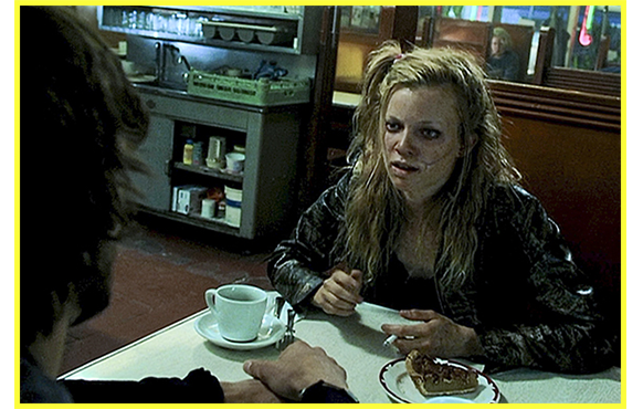 I 自分が爆破事件に直接関与したことを知ったエヴァンは、寮で目が覚めて思わず吐く。そして、お腹にできた火傷〔それまでは、なかった〕に触れ(写真I-1)、自分が過去で「違った」ことをすれば、それが現在にも変化を及ぼすことに気付く。もっと情報がないかと、エヴァンは母をレストランに招いて、父のことを知ろうとする(写真I-2)。「ジェイソンは、言ってなかった? 記憶喪失でなくした記憶を 思い出す方法を見つけたとかいうようなこと」。「なぜ訊くの?」。「いや、ただ、頭のいい人だったら、失くした記憶を思い出す方法を見つけたかもと思って」。「そうね、今のあなたとちょうど同じ年頃の時、過去を思い出す方法を見つけたと言ってた。それが本当の記憶だったのか、そう思い込んでいただけかは分からないけど」「それと、病状が悪化して強制入院させられる直前に、できるようになったとか…」。「何を? 何ができたの?」。「忘れて。なんでもないの。その頃にはかなり変だったし」。これで、エヴァンの想像は、確信のレベルに達したと思われる。その状態で、再度故郷に戻り、ケイリーに係わる記憶を確かめようと思い立つ。ケイリーは、路傍のしがない食堂でウエイトレスとして働いている。他のウエイトレスとぶつかって料理の皿を落としたり、客にお尻を触られてもニコッとしたりする有様。注意力散漫は生きる意欲や目的を失っているからだし、性的にふしだらなのは15歳まで一緒に暮らしていた父親の影響だ。そんな風に変わってしまったケイリーを寂しげに見るエヴァン。仕事が終わるまで待っていて、ケイリーに話しかける。ケイリーは喜ぶが、エヴァンが、記憶喪失で消えていた記憶の一部が戻って来たので確かめたいと言い出し、7歳の時の児童ポルノ事件のことを訊こうとするで、「何が知りたいの?」と態度を急変させる。「つまり… 地下室で何があったのかな?」。これは、ケイリーにとって、最も触れられたくない記憶だ。「ずっと前の話よ」。「分かってる」。「そのために戻ってきたの? 下らないビデオのことを質問するため?」。「ただ、何か悪いことが起きたに違いないと思って…」。「そんなこと、何の意味があるの?」。「何があったにせよ、僕らの責任じゃない」。しかし、ケイリーの怒りは高まる。「君のために戻って来る」と紙に書いて町を去っていった最愛のエヴァンが、これまで自分をほったらかしにしておいたくせに、戻って来たと思ったら、最悪の過去の詮索をするためだったからだ(写真I-3)。ケイリーは、エヴァンに文句を並べた後で、「私が好きだったら、なぜ電話くれなかったの? なぜ、ここで朽ち果てるままにしたの?」と言い残し、泣きながら夜の闇に走り去って行った。