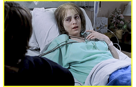P 第3のパラレル・ワールドに移行したエヴァン。この世界でのエヴァンは、13歳の時の犠牲的行動で 両腕を失っている(写真P-1)。ケイリーとレニーは精神的にも健康で、お互い愛し合っている。その姿を見ているだけで、エヴァンは辛い。エヴァンは、「僕らのこと 考えたことある? つまり、考えたことあるかな… もし、状況が違っていたらって?」とケイリーに訊いてみる。「もちろんよ。あなたは、私が好きになった最初の人だもの」。「僕が?」。「そうよ。だから、小さかった頃、母と暮らせなかったの」。「分からないな」。「両親が別れた時、どちらと暮らすかを、私とトミーに選ばせたの。父には我慢できなかったけど、もし、母と一緒に引っ越すと、あなたに二度と会えなくなるから」(写真P-2)。これは、非常に重要な情報だった。両腕がなく、彼女もいないエヴァン。そのエヴァンの心を最後にプッシュしたのは母の病気。病院に連れて行かれたエヴァンは、末期の肺癌で病床についている母と面会する(写真P-3)。13歳で両腕を失くした息子の将来に悲観した母は、この世界では、ヘビー・スモーカーになっていて、肺癌を患っていたのだ。