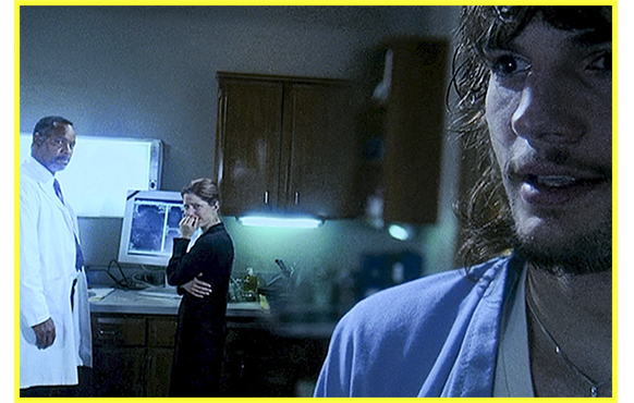 R ケイリーは爆死し、エヴァンは第4のパラレル・ワールドへ。エヴァンは、精神病院のベッドに寝ている。7歳の時、目の前で、自分のせいでケイリーが死ぬのを見て、精神的に強いショックを受け、それからずっと入院している。何とかしようとベッドの下を覗くが日記は1冊もない。医師の部屋に飛び込み、「僕の日記、どこです?」と訊く(写真R-1)。しかし、エヴァンは、事故後すぐに入院したため、そもそも日記など存在していないのだ。医師も、日記のことは何度も聞かされていて、「ケイリーを殺した罪悪感が引き起こす想像の産物」だと思っている。如何にも精神病の重症患者そのものだ。次のシーン。医師が、CTの検査結果を母に説明している。「損傷は回復不可能です。正直言って、運動機能が失われていないことが不思議です」。涙にくれる母。エヴァンはその部屋に入って行くと、母に、「昔 撮ったホーム・ムービー、忘れずに持って来てくれた?」と訪ねる。「ええ、今 持ってるわ」。「よかった。すごく見たかったんだ」(写真R-2)。日記が存在しないので、ホーム・ムービーを見ることで、過去に戻ろうとしたのだ。かつて母から、父がアルバムを必死で捜していたと聞いたことが、その背景ある。ケイリーは、医師が母に「明日の朝一番で、ベルヴュー転院させます」と話すのを漏れ聞き、深夜医師の部屋に侵入する。そこからは、冒頭でのシーンと重なる。追加されているのは、メモを書き終えてから、8mmを見始めるシーンだ(写真R-3)。