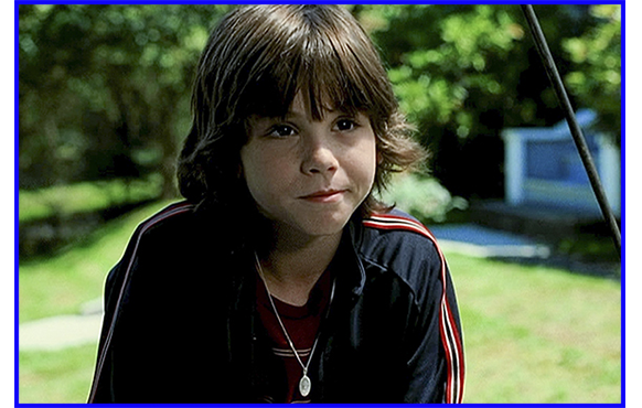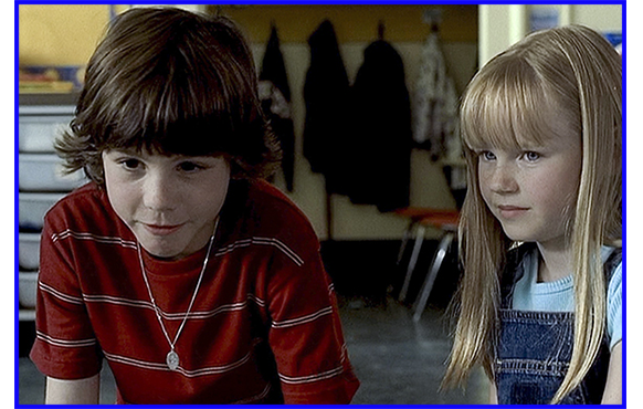 J 翌日の講義を終えて、夜エヴァンが寮に戻ると、留守録にトミーからのメッセージが入っていた。「やい、俺の妹に何を言った? 昨夜は、1時間以上も電話で泣いてたぞ。会ったんだそうだな。彼女は… 今夜自殺しやがった。死んだんだ。お前もだぞ」。あまりの衝撃的な内容に呆然とするエヴァン。町を訪れるが、埋葬の場には怖くて近寄れない。全員が引き払ってから、棺の上に花束と、なぜか今まで取っておいた「君のために戻って来る」と書いた紙を投げ入れる(写真J-1)。寮に戻ったエヴァンは、火傷の傷跡ができた経緯から、逆に、ケイリーの心の傷跡も直せるのではないかと思い立つ。そして、地下室で児童ポルノを撮らされていて記憶喪失になった日の日記を読み返す。すると、突然、7歳に戻り、ケイリーの家の裏庭に立っていた。ケイリーの父が、「地下室に行こう。地下牢みたいな感じが出る」と言う。頷くエヴァン。しかし、このエヴァンは外観は7歳だが、実際は20歳のエヴァンがコントロールしている。地下室に行き、父親がビデオをセットし、ロビン・フッドがマリアンと結婚するシーンを撮ると言い出す。「そして、大人みたいにキスしたりセックスする。だから服を脱ぐんだケイリー。さあ、風呂に入るのと同じだろ。大騒ぎすることじゃない。君もだぞ、エヴァン」。この時、エヴァンが、「耳を塞いでて」とケイリーに言葉をかけ、おもむろに父親に言い始める(写真J-2)。「今は、どんな時だ?」。「言われた通りにする時だ」。「違うな、ドアホ。これは、お前への罰の決定的瞬間だ。次の30秒で、2つのドアの1つを開けるんだ。1つ目のドアは、お前が血を分けた子に、生涯続くトラウマを与える。結果として、お前の娘は、病的な小児性愛の父親によって信頼を裏切られ、可愛い子供から 抜け殻になる。最後には、自殺に追い込まれる。素敵だな、パパさんよ」。「お前は誰だ?」。「お前を見張ってる者だよ、ジョージ。もう1つの選択は、ケイリーに、愛すべき父親が娘を扱うように接してやるんだ。そうするだろ、パパさん? よく聞けよ、ドアホ。もしまたバカしやがったら、誓って 去勢してやる。あと、お前に必要なのは、息子のトミーに自制心を持たせる(discipline)ことだ。あいつは、加虐的なガキだからな」。最後にエヴァンは、ケイリーに耳打ちし、「二度と私に触らないで」と言わせる(写真J-3)。子供の口から、子供の声で発せられる大人の言葉。父親も恐怖を感じ、言われた通りにする。ただ、問題は“discipline”には「罰する」という意味もあり、この介入によって生じたパラレル・ワールドでは、父親はケイリーには指1本触れなかい代わりに、トミーを執拗に殴ったため、彼はより凶暴な人間になってしまう。