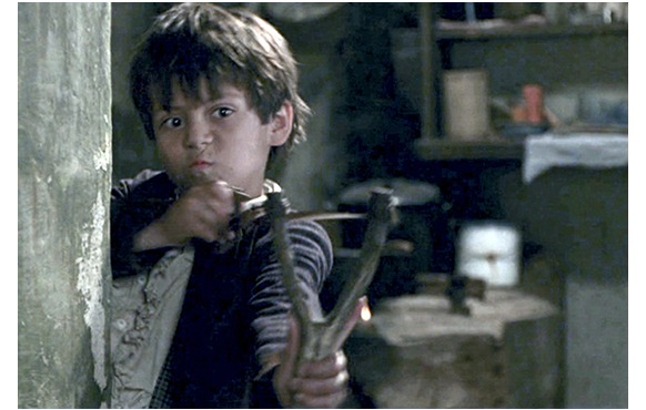 牢屋からの脱出シーンもコミカルだ。酒場の店員兼牢番の4人が食事を始めようとしている時、給仕担当のお尻をパチンコで一撃。ホアキンの顔が面白い(1枚目の写真)。これは、すごく痛くて、4人で喧嘩になる。その時、もう一発。今度は、顔を見られてしまう。その時の顔が傑作(2枚目の写真)。フリルはもうくしゃくしゃだ。追って来るのを見越して、通路に丸くなるホアキン。それにつまずいた男は、頭を壁に激突させて気絶、ホアキンは楽々と鍵を手に入れる(3枚目の写真)。「ホアキン、お前は天才だ」と父に褒められるが、すぐに、「だが、パパの許可なく、牢破りに係わるんじゃないぞ」と釘をさされる。
