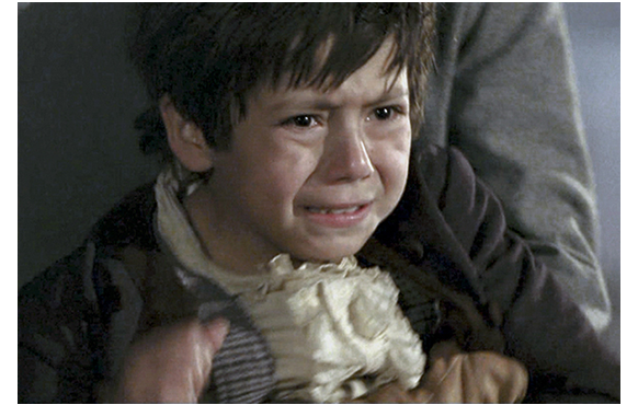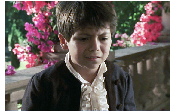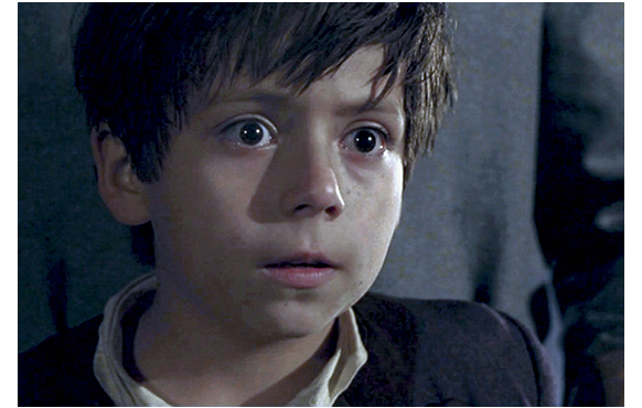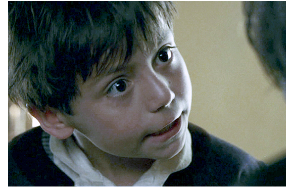 どうせ父は飲んだくれているだろう、と酒場まで見に来たホアキン。店員に文字通り放り出されて、悪態をついている。フリル付きのシャツを着た〔つまり、上流の〕少年を扱うには手荒過ぎるような気もするが、「地獄に行ちっちまえ」という悪態も下品だ。その声を聞いて父は耳を疑うが、姿を見て納得し、「ホアキン」と声をかける。「おい、ここだ」。「パパ?」。「酒場なんかで 何してる?」。「牢屋で 何してるの?」(1枚目の写真)。「先に答えろ」。「ずっと パパを捜してた。ママのことで」(2枚目の写真)。「どうかしたのか?」。「しない。それとも、したかのな…」「男が 家に来たんだ」(3枚目の写真)「結婚を申し込んで、ママは『はい』って答えた」「まだ愛してるよね。ママに何か言わないと」「牢屋なんかにいないで! 何でいるのさ?! 止めてよ」。「ホアキン、聞くんだ」「ここから出るのを助けてくれ。そしたら、母さんを取り戻す」「もう一度 家族になる。約束だ」。この場面、同じ角度の3枚だが、表情が全部違う。一番気に入ってるのは2枚目。表情が多様な子役は、演技が上手な証拠でもある。