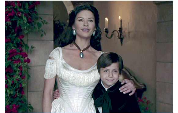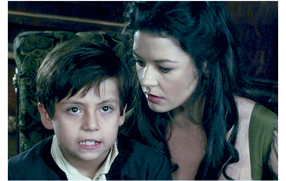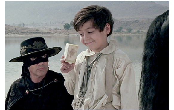 ゾロに救われたホアキンは、一緒に馬に乗せられて町に向かう。途中、湖畔で降ろされ、「信じられないや。本物のゾロだ」「これトルナード、でしょ?」「わぁ、こんなに大きいんだ」と馬にも大感激。上腕の傷を調べるゾロに、「かすり傷だよ」「何か言いたいことある?」。ゾロは、「スペイン語で話せ。父親の言葉だろ」。「母様も信じないよ」。「いかん。このことは、母親に話さん方がいい」。「どうして?」。「質問は私がする。なぜ 学校にいない?」。「顔に焼印のある男。何かたくらんでる。やっつけないと、あんなクソ野郎」(1枚目の写真)。「言葉遣いに気をつけろ。あの者達は人殺しだ。あの木枠の中味は、非常に危険なものだった。君を助けるため、中味を確認できなかったがな」。ホアキンは、さっき頂戴したサンプルを、自慢げに「このこと?」と差し出す(2枚目の写真)。それを見て、「石鹸か?」と驚くゾロ。「全部これだった?」。「山みたいに」。「本当か?」。「あなたをだます?」。「スペイン語だ。それに、これはゲームじゃない。君がしたことを知ったら、父親は心臓発作を起こすぞ」。「まさか。気にも留めないさ。昨日も、僕のこと忘れてた」(3枚目の写真)。板ばさみとなったゾロも苦しそうだ。「忘れてたとは思わない。君が理解すべきことは…」と言いかけて、「いや、父親は、ちゃんと来るべきだった。次は、そうするだろう」と反省の色も。「どうして分かるの?」。「分かるんだ。約束する」。この部分だけ、会話のほとんどはスペイン語だ。もともと、アドリアンは、この映画の主演が決まるまで英語は全く話せなかった。だから、スペイン語の話せるゾロ役のアントニオ・バンデラスはいいとして、スペイン語の話せない母役のキャサリン・ゼタ=ジョーンズとは最初の頃、大変だったとか。