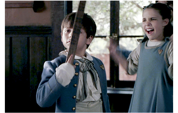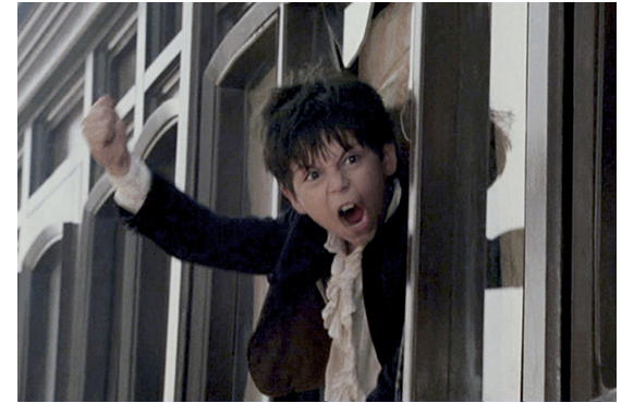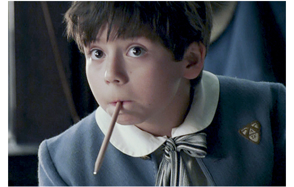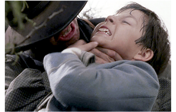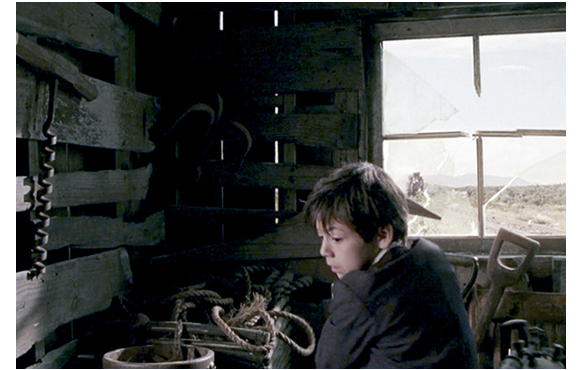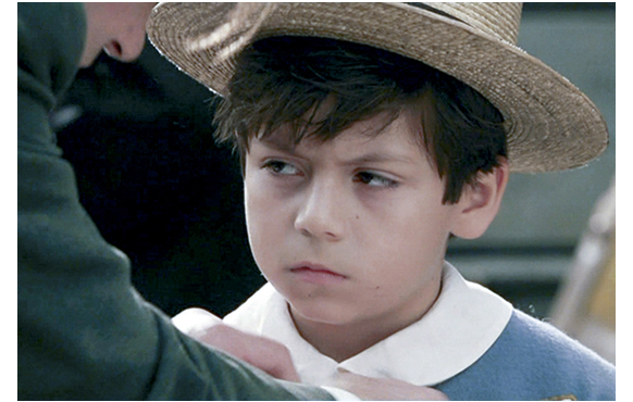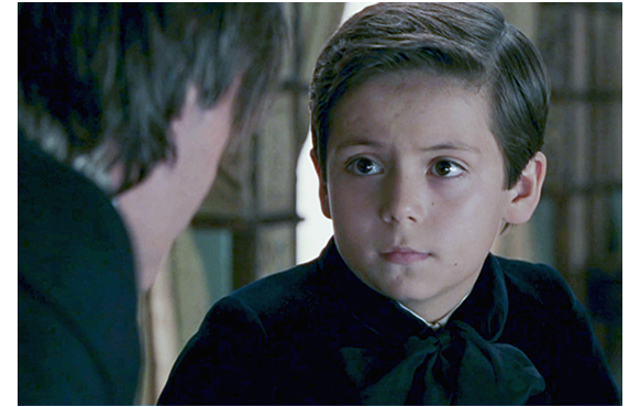 恐らくその日の夕方、アルマン伯爵が母を館まで馬車で送ってくる。そして別れ際に何度も熱いキスを交わす。それを2階のバルコニーから見ていたホアキンの顔は悲壮だ(1枚目の写真)。一方、父は、町を歩いていて、ピンカートンの探偵に、強力な睡眠薬を指輪に仕込んだ針で一撃され、乗った馬車内で昏睡状態に。そのまま牢獄に監禁される。因みに、2人いる探偵の1人は、アメリカの超人気TVドラマ『LOST』で、謎めいたベンジャミン・ライナスを演じて高い評価を得たマイケル・エマーソンだ。一方、家では、フリル付きのシャツを着たホアキンが勉強のフリをしている(2枚目の写真)。背後から、母が、「すぐに戻るわ」と語りかけ、伯爵の家へと向かう。母の秘密任務も終盤に近付いている。ホアキンは、母がいなくなると、すぐに窓から木を伝って脱出する。父を捜すためだ。