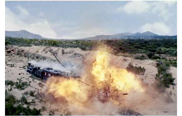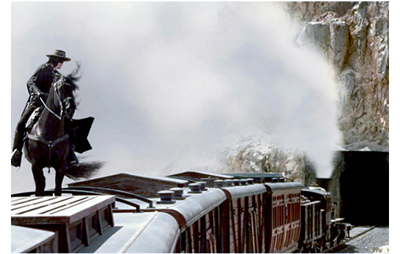 伯爵が、ホアキンを人質にしようと首ねっこをつかんだ瞬間、天井の明り取りガラスを破ってゾロが伯爵の背後に降り立つ。一方、ホアキンは怪力男の足を蹴飛ばし、母が手刀を一発決めて、母子で後方車両に逃げる。伯爵は、男に2人を追わせ、自分は、ゾロと一対一で戦う。2人の激しい剣戟が続く(1枚目の写真)。見せ場の一つだ。一方、トルナードのいる貨車の手前まで辿り着いた母子。母が、「ホアキン、このまま行って」「貨車が止まったら、外に出て線路に沿って戻るのよ」と言い、連結器の上を歩かせて貨車に行かせ、連結器を解く。残った母は、追って来た男と、ニトログリセリンの車両で激しい戦いをくり広げる。ホアキンの乗った貨車は停止し、ホアキンはトルナードに乗って貨車から飛び降りると(2枚目の写真)、全力で汽車を追いかける。ゾロと伯爵の戦いは、ゾロが優勢となり、伯爵は機関車に向かって逃げる。母と男の戦いでは、男が刃を振り回した際、車両の横の扉を開けてしまう。母は、正面から襲ってきた男に、ニトログリセリン入りのシャンペン・ボトルをかざして躊躇させると、隙を見て、ボトルを男のズボンにはさみ、開いた扉から蹴落す(3枚目の写真)。そこには丁度、南軍の将軍がいて、男ともどもニトログリセリンで木っ端微塵になった。