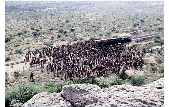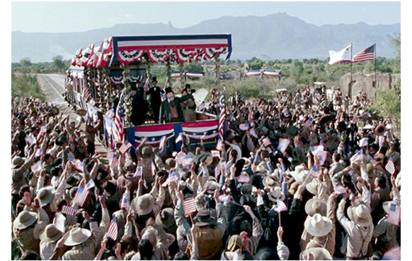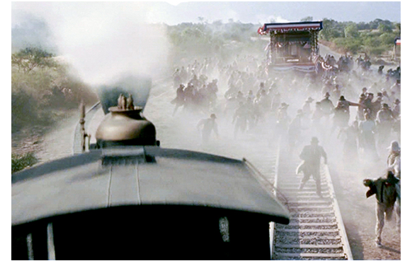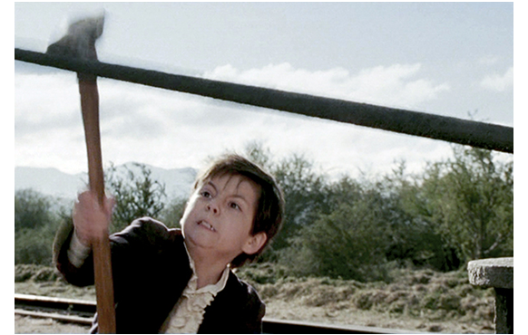一方、線路上に停めた特別車両で、独立州制定の調印式が行われている。普通なら最大の町の中心で行われるべきだろうが、映画のクライマックスを演出するため、敢えて線路上で行うという設定にしたのであろう。その会場を見おろす丘の上にホアキンが現れる。そして、下に集まる群衆(1枚目の写真)と、そこに向かって突進してくる汽車の両方を見て、式典を救うべく丘を駆け下りる。しかし、ここで新たな疑問が浮かぶ。ゾロですら追いすがるのがやっとだった汽車に、後方から追いかけてどうやって先行できたのか? これも、面白ければそれでいいと無視して、次へ移ろう。調印式用に停めた車両では、署名しようとしてインク瓶が揺れ始め、そこで汽車が猛スピードで接近して来ることに気付く。散り散りに逃げ出す群衆。そこにホアキンが到着し、分岐器の操作室に駆け込んで大きなハンマーを取り上げると(2枚目の写真/窓には突進してくる汽車が見えている)、手動式の分岐器をハンマーで叩いて動かそうとする(3枚目の写真)。特別車両の停まっている場所は、ちょうど廃線との分岐点の向こう側で、突進してくる汽車を廃線の方に入れることができれば、衝突を避けられるからだ。それに気付いたのがホアキンだけだったとは?! しかし、小さな子供の力では、てこの原理で動く原始的な装置を動かす事ができず、逆にハンマーが折れてしまう。