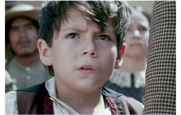 アドリアン・アロンソ(Adrián Alonso)がメジャー映画で大活躍するコメディ風アクション大作。アドリアンはコメディ部分の大半と、アクションの一部を担っている。撮影時は10才くらい。小さな体を駆使してのギャグとアクションは気合が入っているし、表情は多様、すごく芸達者な子役だ。たどたどしい英語と、時々使う流暢なスペイン語は、カリフォルニアがメキシコ割譲地だった時代背景にぴったりだ。出番は飛び飛びで、冒頭と、学校での大活劇の後は、40分近く出番がないが、後半、特に最後のクライマックスはアクション・シーンにも参加している。エンドクレジットでは主役2人、それに次ぐ5人の後に「and」で登場し、重要な役柄であることを示している。