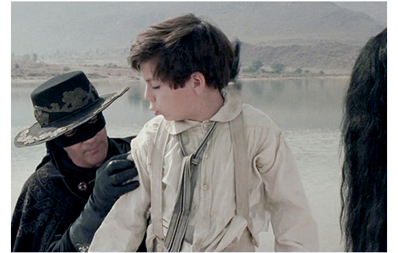 そこは2階だったが、目の前にある旗竿を滑り降りて、無事着地。窓から見ているみんなに手を振り(1枚目の写真)、窓から顔を出した教師に投げキスをし、見物人に腕を広げて優雅に挨拶する。得意満面で振り向くと、そこには父が。如何にもマズいといった顔で「パパ?」と言うホアキン(2枚目の写真)。実に可愛い。その後で、父子が町を歩いている。「どういうつもりだ? キンテロ神父が放校にしなくて幸運だった。言い訳するな。なぜ喧嘩ばかりしてる?」。「分かってないね。時には、戦わなきゃ」。「そうか? 誰が言った?」。「彼さ」と言って、壁に描かれた「ゾロ 万歳」の落書きを指す。「いいか、ゾロがここにいたら、戦いだけが解決法ではないと言うぞ」。「なんで分かるの?」。「私を信じろ。ゾロのことは よく知ってる」。「知るはずない。戦ったこともないくせに。ママのことすら 戦わなかった」。「私は お前の父親だ。そんな口はきくな。お前と母さんのためなら、どんなことだってする。分かったか?」。ホアキンのシラケタ顔が面白い(3枚目の写真)。その直後、父が親切にしてやっている貧しい農民が声をかけてくる。しばらく話していると、そこにマックギヴンスが再登場。最初の場面で、ゾロと闘った時、顔面を蹴られたので、木製の総入れ歯になっている。そのマックギヴンスが、農民に「500ドルやる。その代り、神の思し召しに従い、貴様のボロ小屋の証書をよこせ」と凄む。売らないという農民。そこで、父が口を出す。「売らないと 言ってますぞ」。「どこかで会ったね、旦那?」。「木の入れ歯男など 覚えとらん」。「白人みたいな服を着たメキシコ野郎なら 覚えてるぜ」。さらに、ホアキンに向かって「お前のパパさんは おんどりかな? それともめんどりかな?」と訊く。「息子に構うな…」と言いかけたところで、父は顔面を殴られ、「紳士として、息子には教えておかねば。右の頬を…」と言いかけて、「左の頬もか?」とまた殴られる。警察が現れ事は収まったが、収まらないのはホアキン。抵抗も反撃もしない父の手を振り払い、軽蔑の目を向ける(4枚目の写真)。