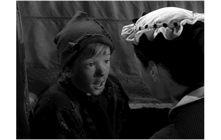 ウィーラーは、ロンドンの地下牢に監禁されている(1枚目の写真)。そこに、警部(?)が入って来て、「メリー・クリスマス、ウィーラー」と声をかける。さらに、「取り調べの際、お前は、以下の友人と知人の名前を、潔白さの証人として挙げた」と言い、7人の名前を読み上げる。そして、ウィーラーが牢獄の戸から出ると、そこには11人の男女がずらりと並んでいた(2枚目の写真)。懐かしい顔を見たウィーラーは笑顔になって、「やあ、スパロー」と呼びかける(3枚目の写真)。スパローは、思わず「新しい服着てる」と言うが、隣のおばさんから、「お黙り」と制止される。警部が、「この少年を知ってるか?」と訊くと、スパローは、「一度も見たことありません」と答える。「スパロー、おいら ウィーラーだよ」。「何だと?」。「知ってるだろ」。「嘘つくな!」。警部は再度、「この少年は、お前達を知ってると言っておる。お前達は知っとるか?」と訊く。すると、全員が様々な言い方で否定する。「本当か?」。一斉に「はい」。「おいら、ウィーラーだよ!」。「ウィーラー? 誰だね?」「聞いたことないな」「誰だ?」。警部は、部下に、「連れ出せ」と命じる。ウィーラーは、出て行こうとするスパローに声をかけるが無視される。必死になったウィーラーは、警部に、「スパローは、おいらの友だちなのに、なぜ あんなこと言うの?」と尋ねる。警部は、ウィーラーがもう一度スパローと話すことを許す。2人だけになったウィーラーが、「なぜ、あんなこと言ったの?」と訊くと、スパローは、「なんで俺のことをサツに言った?」と非難する。「名前を言っただけだよ」。これで許してもらう。「なんで捕まった?」。「ウィンザー城にしのび込んだから」。「ウィンザー城?」。「警官にきいてみてよ、話してくれる。王座にも座ったんだ」。「なんで行ったんだ?」。「女王さまを見たかったから」。「殺されたんだぞ」。「誰が?」。「女王だろ」。「誰が殺したの?」。「人殺しさ」。「いつ?」。「昨日だ」。「どうして殺したの?」(4枚目の写真)。「金持ちだからさ。そいつは、60シリングと宝石を盗んだらしいぞ」。「どうやって殺したの?」。「頭を叩き割った」〔とんでもないデマが飛び交っている/盗まれた金額の少なさは、如何にも貧しい浮浪児らしい〕。誰にも助けてもらえないことが分かったウィーラーは、地下牢に戻されると泣き崩れる。