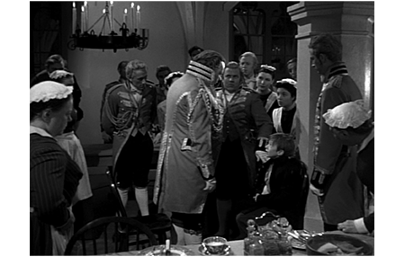 そこで、テーブルクロスをめくって外を覗いてみると、まともに目と目が合う。驚いた召使は、「ここで何してるの?」と訊く。「何も悪いことしてないよ」(1枚目の写真)。「出てきなさい」。ウィーラーは、テーブルの下を這って逃げるが、周りを歩く方が速いので、すぐに引っ張り出される。そして、「気は確か? 衛兵に捕まりたいの?」と訊かれると、「何もしてないったら!」と答える。召使は「あんた誰なの? そんな汚い格好で陛下のダイニングルームに入っちゃいけないのよ」と言った後、ウィンクして、「見つからないよう、外に出ないとね」と言ってくれる。しかし、すぐに複数の男性の召使が入って来て、カーテンを閉めたり、イスを直したりし、その間、ウィーラーはテーブルの下に戻され、女性は、その前で、絨毯の汚れを取る振りをする(3枚目の写真)。