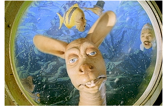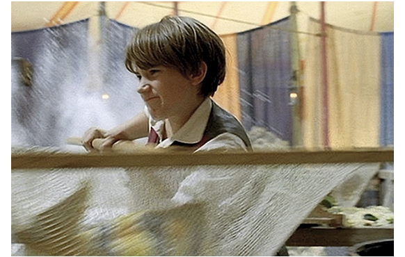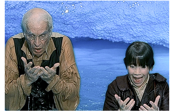 2人は、寄り道をしたことで、学校に遅刻してしまったことに気付く。どうせ今から行っても遅刻で責められるなら、いっそサーカスを見に行こうと決め、教科書を売って入場券を買う。このあたりの「悪い子ぶり」は初代ピノキオと変わらない。2人が中に入って行くと、呼び込みのコビトが、「世界中から集めた恐ろしい化け物の一大コレクションだよ。ネプチューンの深淵に生息する説明のし様がないほど奇妙な生き物が、みんなここにいるよ。どれも本物だ。しかも生きてる!」と煽る(1枚目の写真)。因みにこのコビト氏、ハリー・ポッター・シリーズのグリップフック役とフリットウィック役で知られている人だ。テントの中に入ると、うたい文句とは大違いのインチキの山。凍った人間を、真剣な目で見るピノキオ(2枚目の写真)。大きな水槽の中には、人間のような顔をした変な魚が泳いでいる。マダムの魔法で魚に変えられた子供達だ。「助けて」と言っているのだが、水の中なので2人には聞こえない。だから、ピノキオは楽しそうに見ている(3枚目の写真)。魚の口パクを見たランプウィックが、「あれ何だろう?」と言ったけれど、「必死そうだね」と答えただけ。