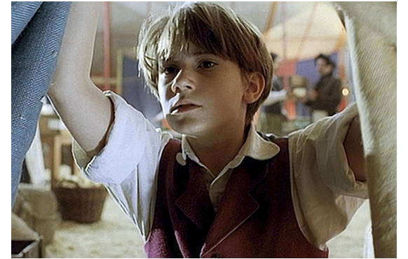 ピノキオがテントの中で1人になった時、青い光とともに、目の前に不思議なものが現れる。ボールを突いている女の子だ(1枚目の写真)。実はこれ、かつてピノキオを人形から人間の子供に変えた青い妖精だ。この妖精は、ピノキオにしか姿が見えない。そして、彼女は、ピノキオに、謎のような言葉を投げかける。「クリームに魔法をかけ、夢を見せる。奇抜な扮装から驚きが生まれる」。ピノキオにはさっぱり意味が分からない(2枚目の写真)。因みに、観客にも分からない。その時、ランプウィックが、「なぜ、何もない場所を見てる?」と訊く。彼には妖精が見えないからだ。ここに、客寄せのコビトが現れ、「いいもの、見せてやる」と2人に話しかける。「何なの?」。「『導き』と『守り』だ」。「どこへ行くの?」「何から守るの?」(3枚目の写真)。「分かるさ。木の頭でなきゃな」。実は、このコビト、ピノキオを守るコオロギの変身した姿。このペンダントは、後でピノキオを助けてくれる。